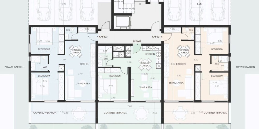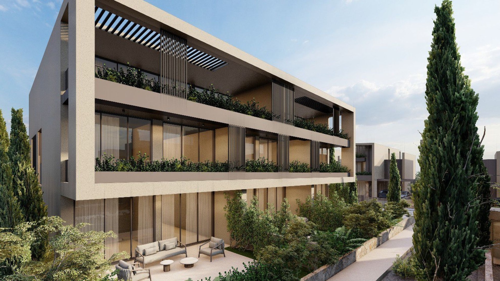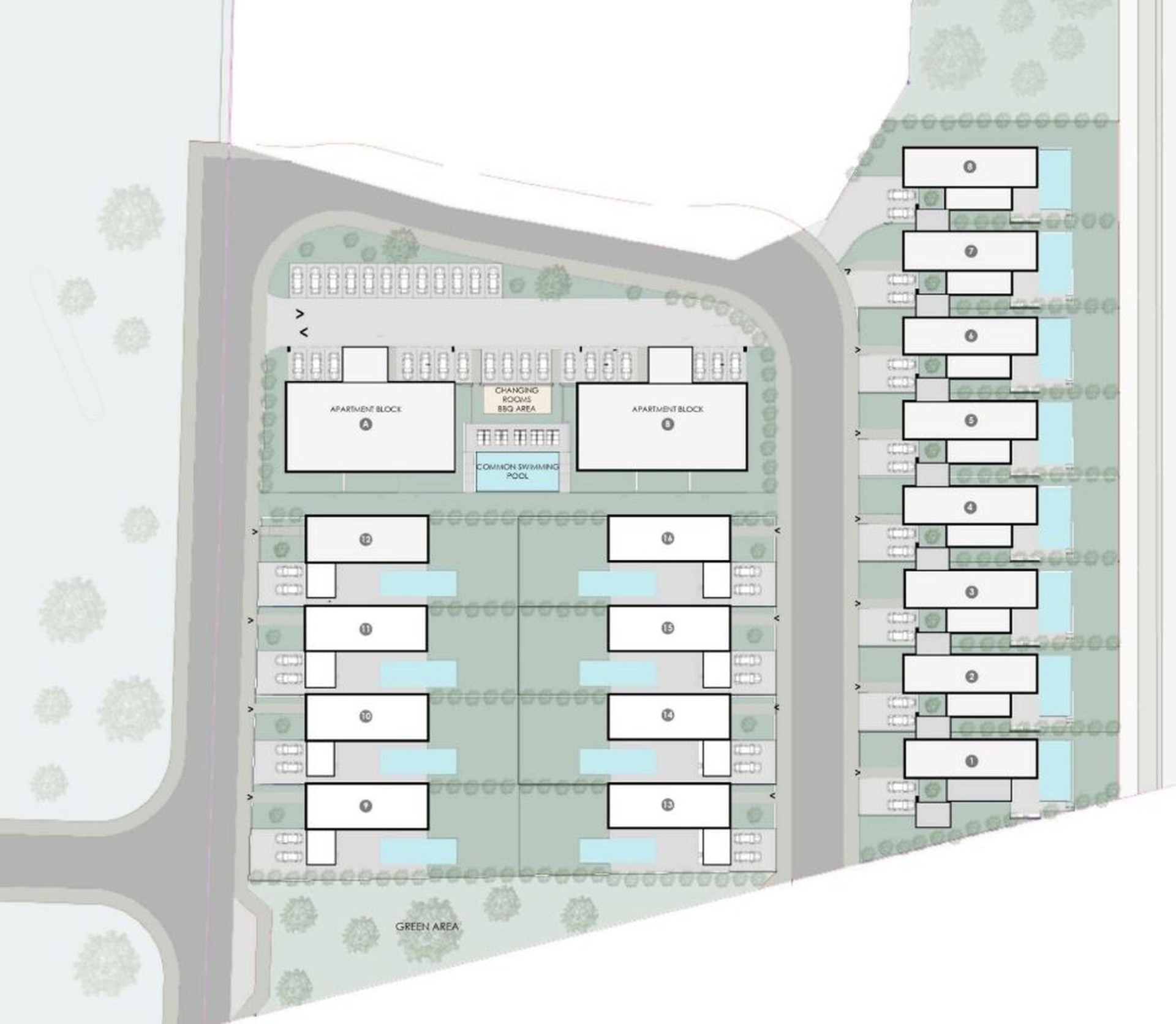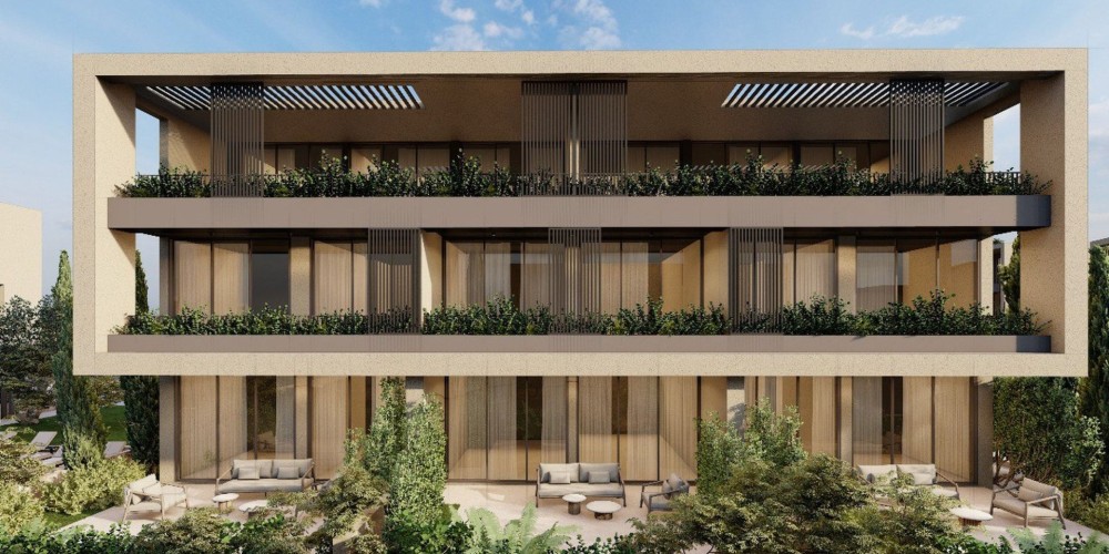 Квартиры на нижнем этаже имеют собственные сады, а общий бассейн и зона отдыха позволяют соседям встречаться и проводить время вместе.