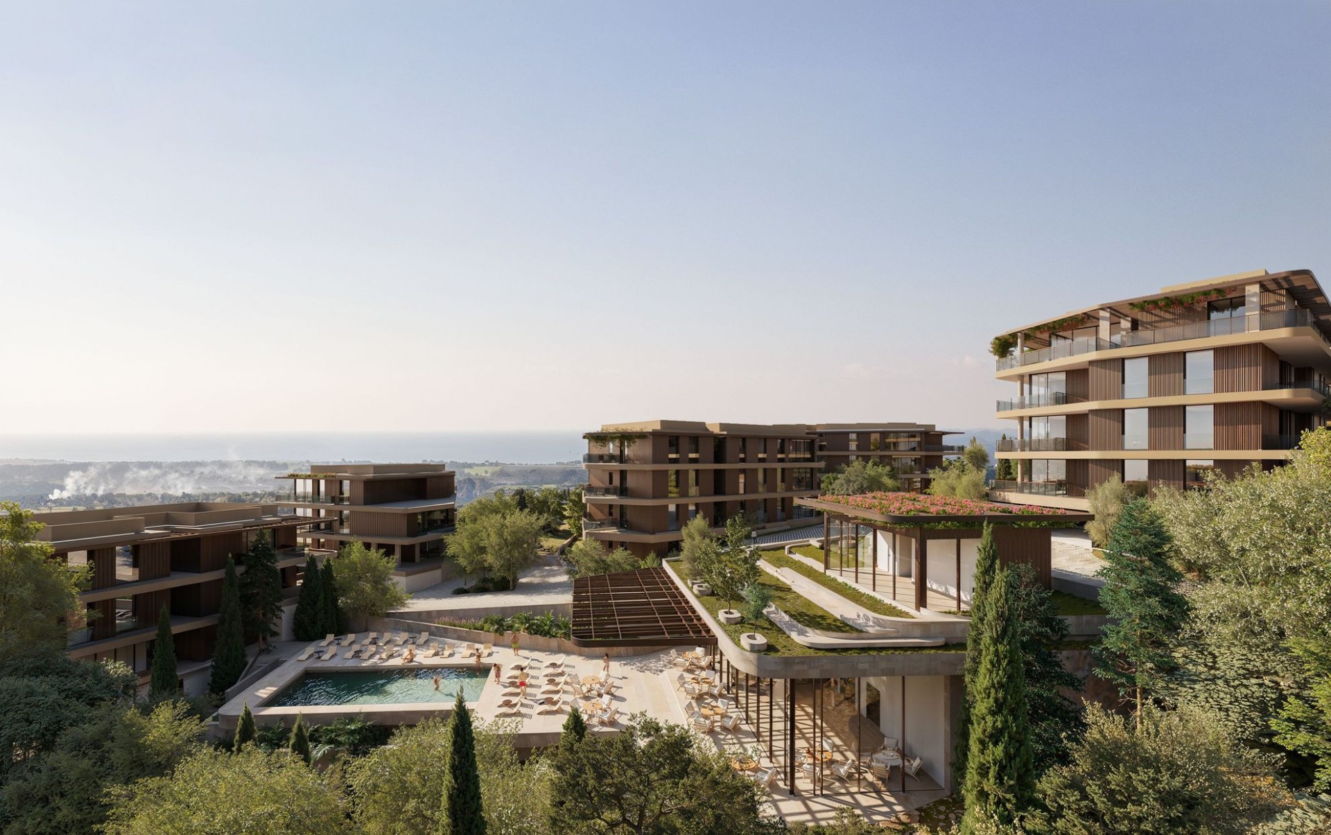 Жильцы смогут пользоваться общим бассейном, а дети - собственным бассейном с жалюзийной решёткой и игровой площадкой.