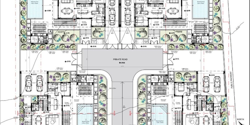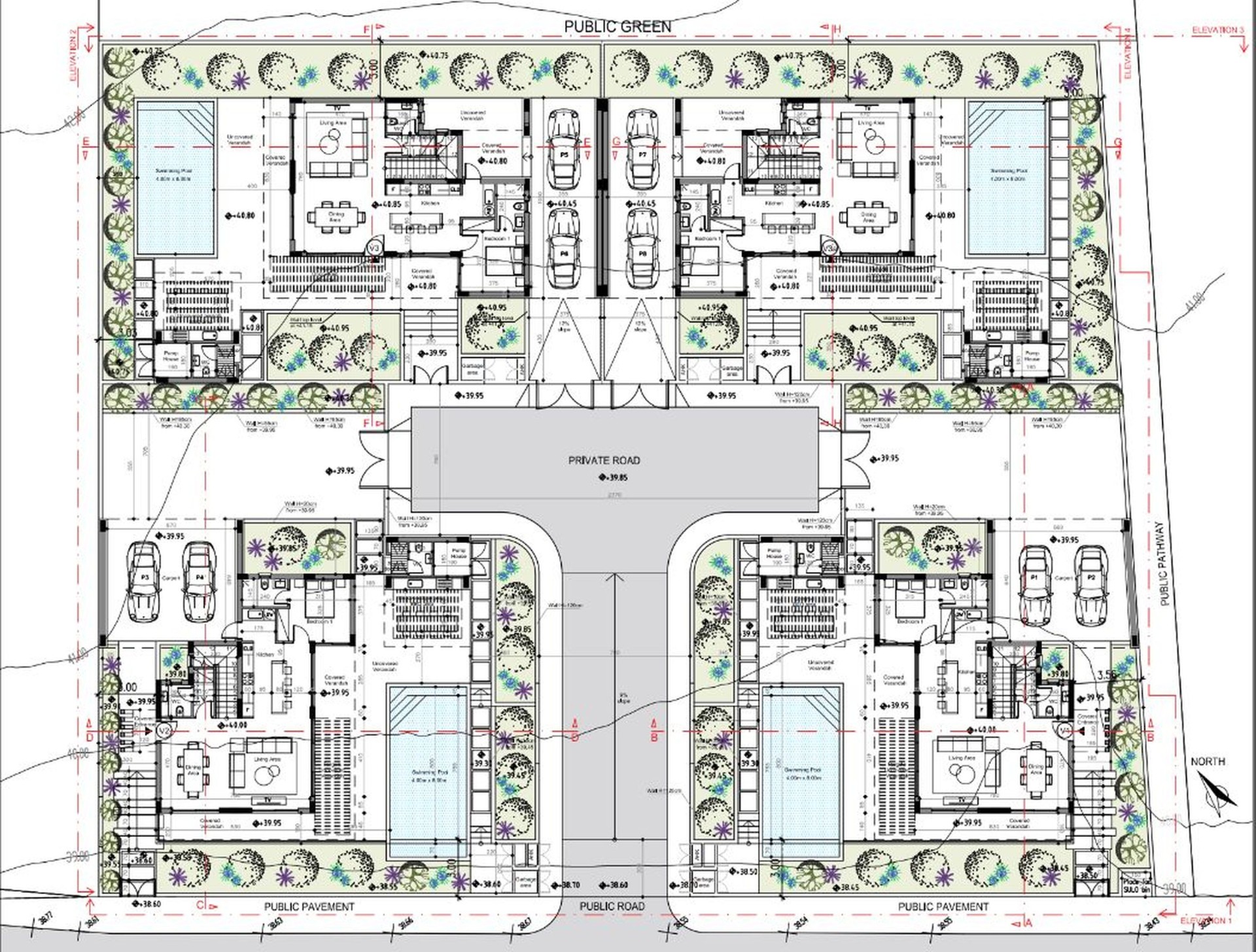 Виллы расположены вдоль частной центральной дороги, обеспечивая легкий доступ к общественной улице. Каждая вилла имеет частную парковку, благоустроенные сады и бассейны, дополненные зелеными зонами и общественной зеленой зоной.