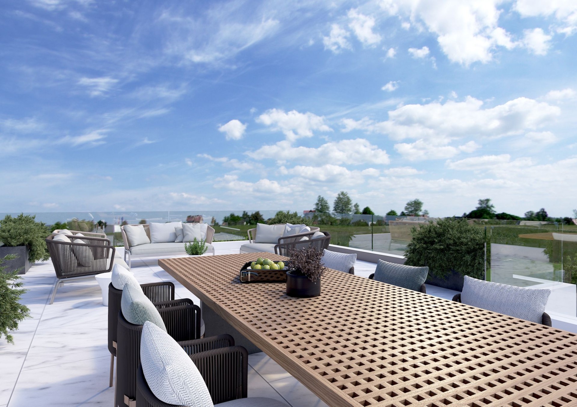 - Сад на крыше с доступом по внутренней лестнице, душ, туалет и место для: барбекю, столешницы, раковины (горячая и холодная вода) и холодильника.